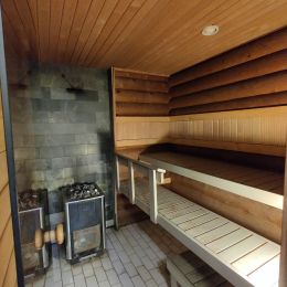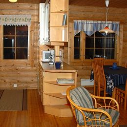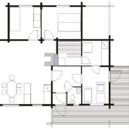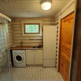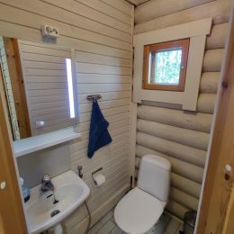 Toukola ist ein für sechs Personen ausgestattetes, geräumiges und helles Blockhaus. Die Wohnfläche beträgt ca. 80 m² und die Zimmer befinden sich alle auf einer Ebene. Im Ferienhaus befinden sich zwei Schlafzimmer und zusätzlich ein Schlafsofa im Wohnraum. Im Saunabereich befindet sich eine Holzsauna, ein Waschraum und ein Umkleideraum, von dem man auch auf die Terrasse zum Abkühlen gehen kann. Vor